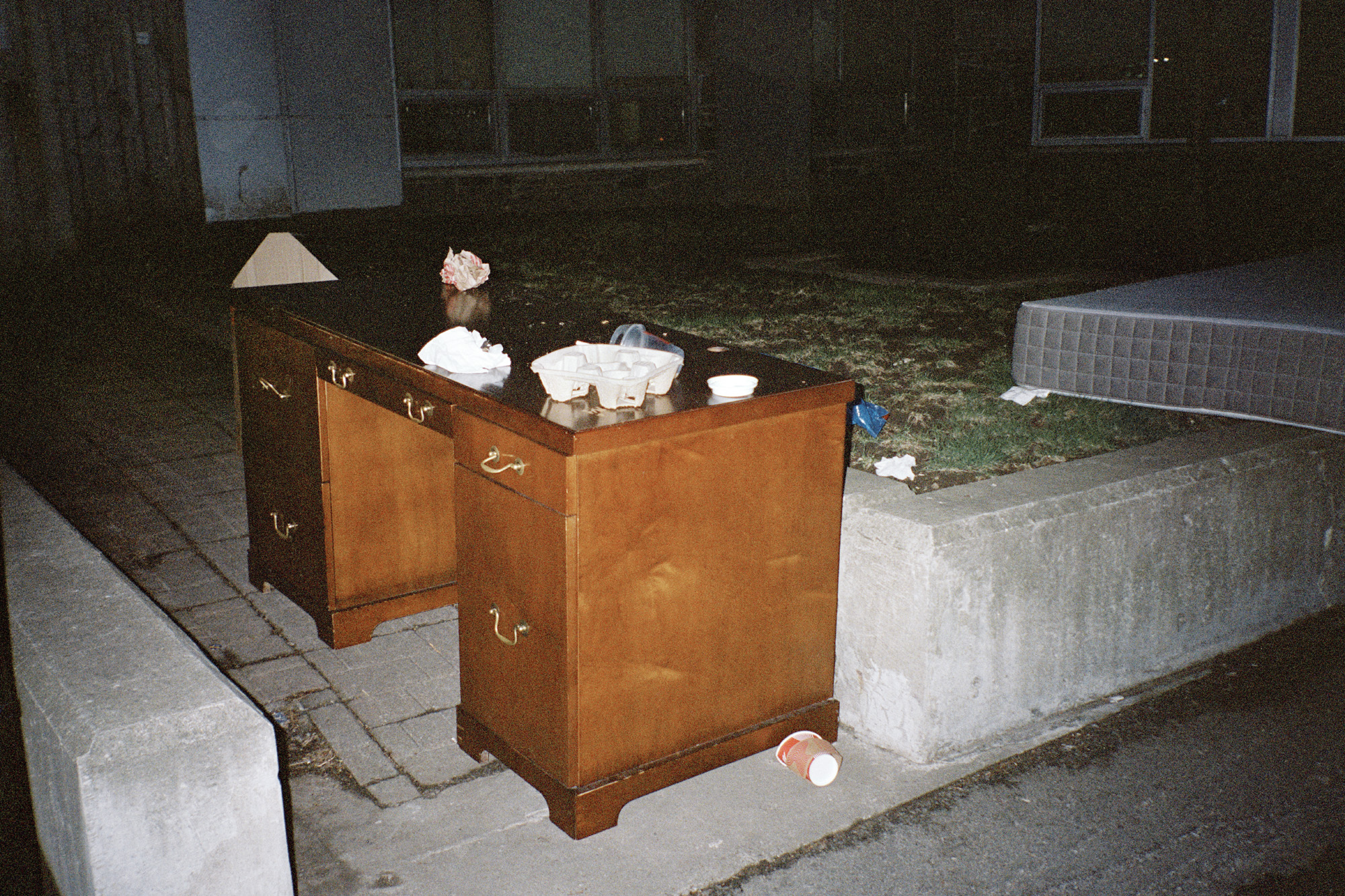 Documenting discarded household items on the sidewalks of Montreal, this series of photographs captures transitional moments, embodied by briefly erected monuments appearing just before garbage collection. In these objects, the artist sees a change in someone’s living situation to which she is familiar. While the objects cannot tell the whole story, they communicate a sense of loss or melancholia, liminality, and the accelerated pace of change in urban settings.